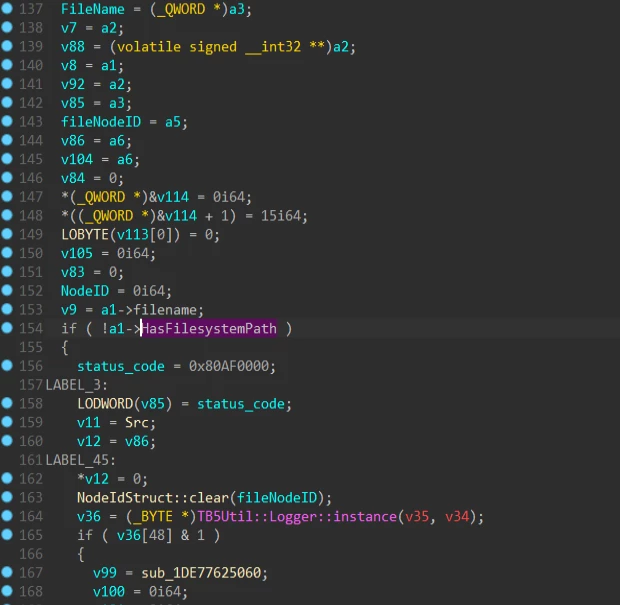 After loading our custom address space we can see the FileDirectory objects created in namespace 0 but calling any one of the FileDirectory methods fails immediately because the object is not linked to any filesystem path. We started looking at the implementation of the FileDirectory methods in order to try and find a way to trigger the SetPath method.