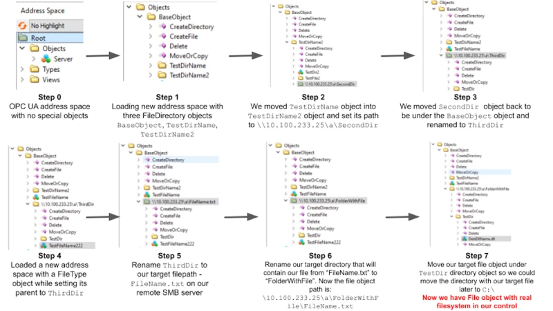 We discovered a specific code flow that lets us create a directory on the remote server and also set the filesystem path of a FileDirectory object. In order to do that, we need to load a specific mapped OPC-UA address space containing objects in a specific hierarchy: